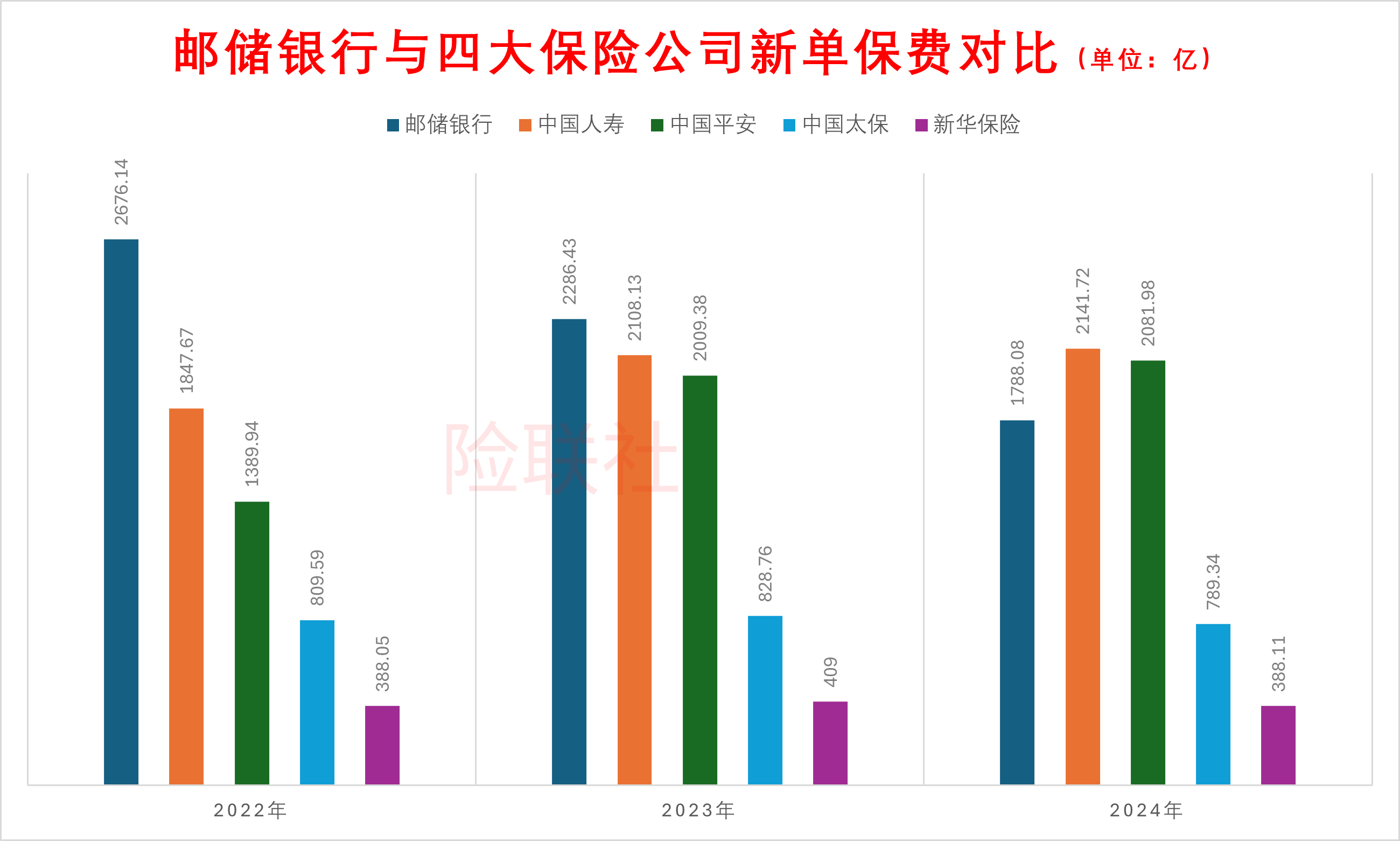 2024年邮储银行称,报告期内,保险持续丰富产品货架,满足客户刚性保障和跨期财富规划需求。代理销售的新单保费中期交保费达1104.50亿元,占比达61.77%,按此测算,2024年邮储银行销售的新单保费合计(期交和趸交)达到1788.08亿。