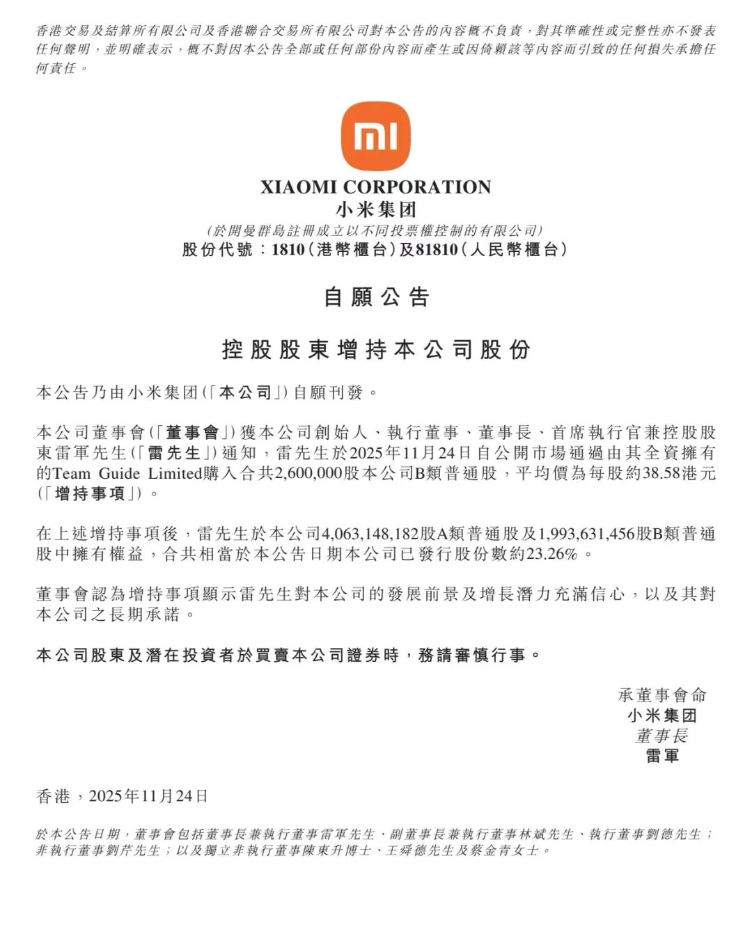 小米集团11月24日于港交所发布公告称,小米集团创始人、董事长兼CEO雷军个人斥资超1亿港元增持小米集团260万股,雷军持股比例增加至23.26%。