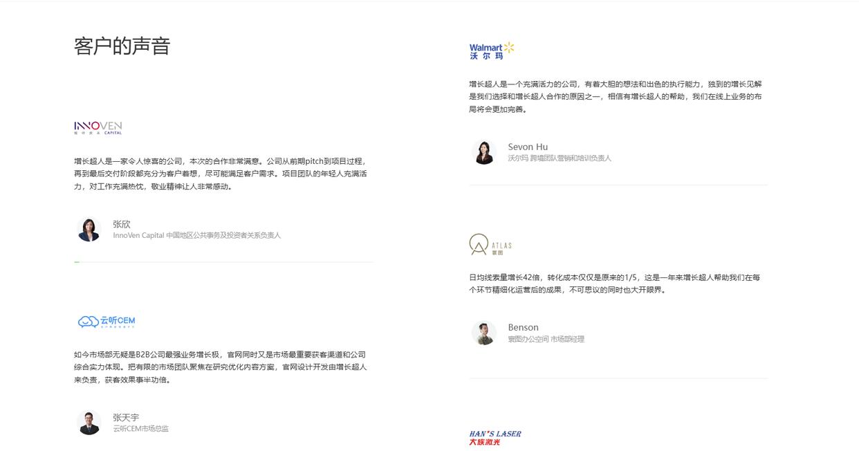适配客户:B端(传统制造、高新制造、科技互联网、软件/SaaS、商业服务、生物医药等);C端(教育培训、生活服务、健康服务、电商、消费电子、金融科技等);全球500强、上市企业、中小微企业、初创成长型企业
