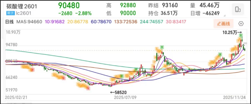消息传出,市场立马发生连锁反应。11月21日,碳酸锂期货主力合约LC2601跌停,24日再度下跌2.88%。仅仅两个交易日,碳酸锂期货价格暴跌11.88%。