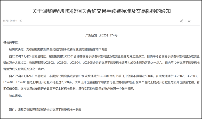 广期所规定,自11月24日起,LC2601合约单日开仓量不得超过500手,LC2602-LC2605合约不得超过2000手;LC2601合约手续费从成交金额的万分之1.2调整到万分之3.2,非主力合约(LC2602-LC2605)也同步上调至万分之1.6。