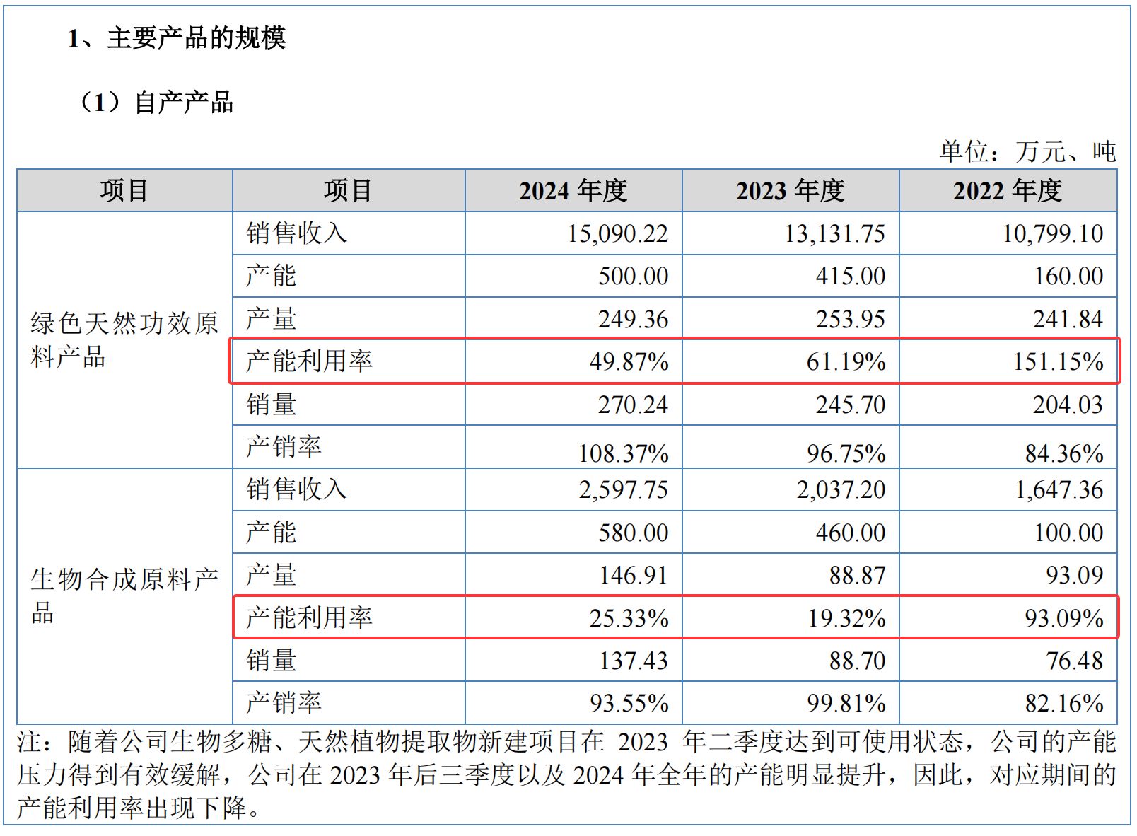 从产能利用率来看,报告期内, 珈凯生物 的主要产品——绿色天然功效原料的产能利用率从151.15%降至61.19%,进而降至49.87%;生物合成功效原料的产能利用率也从93.09%分别降至19.32%和25.33%。