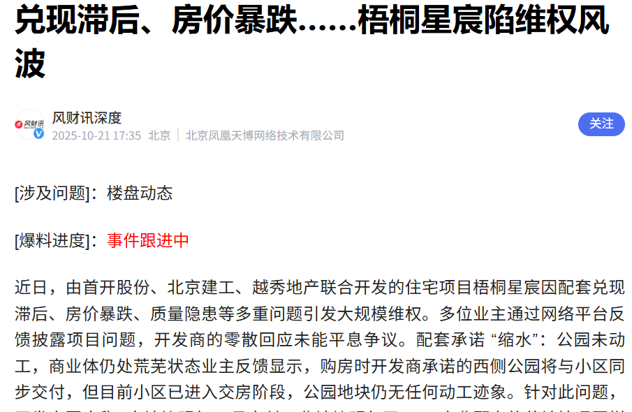 不仅产品设计存在缺陷,越秀北京在交付方面也存在明显短板。近期,由 首开股份 、北京建工、 越秀地产 联合开发的住宅项目“梧桐星宸”因配套兑现滞后、房价暴跌、质量隐患等多重问题引发大规模维权。