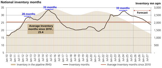 25.4个月:从2010年以来,全国房地产平均库存去化月数为25.4个月,研报预测当前国内约30个月的库存,要在2027年中期才能回落到2010年以来的水平。
