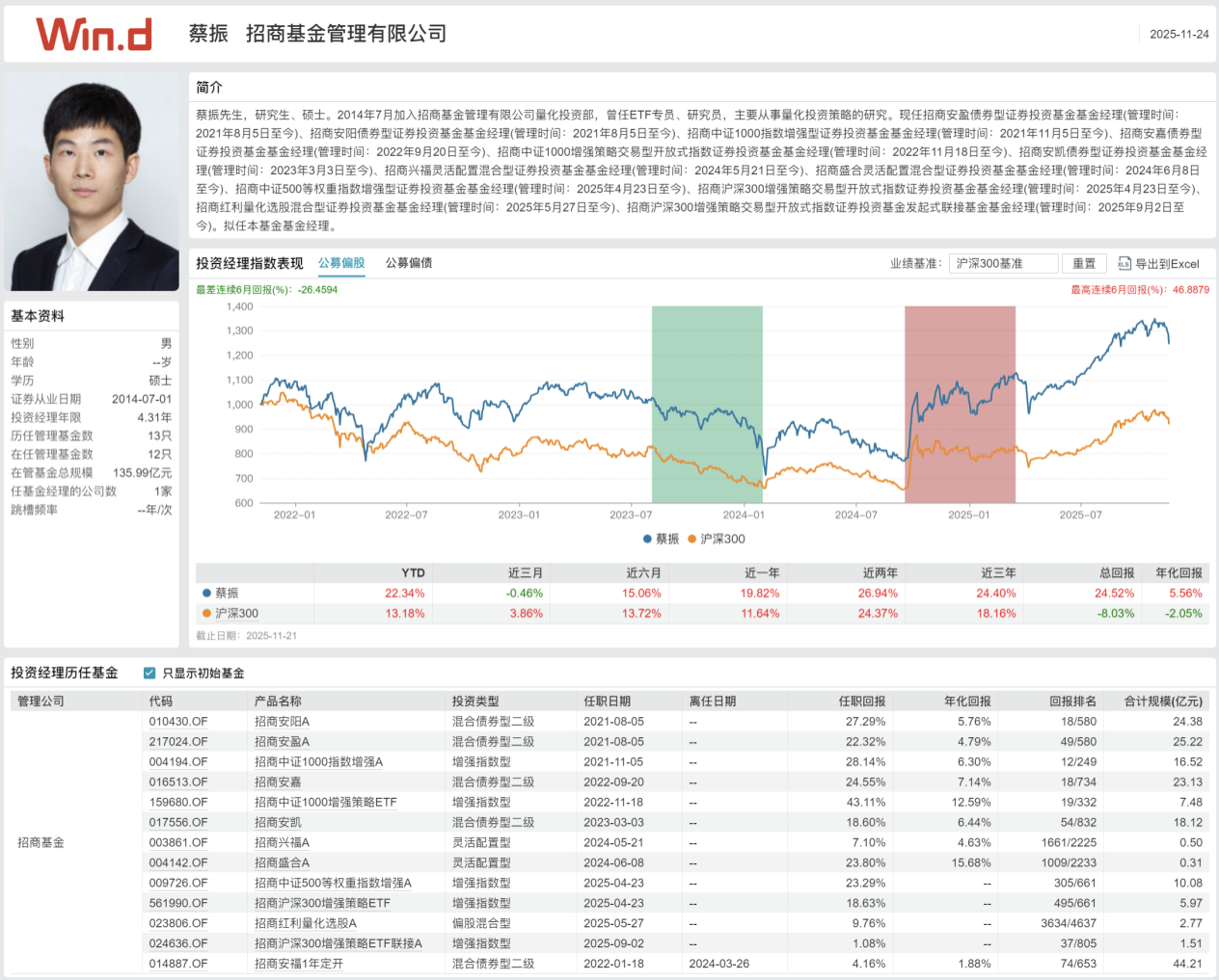 资料显示,蔡振自2014年加入 招商基金 后,历任ETF专员、研究员,主要从事量化投资策略的研究。