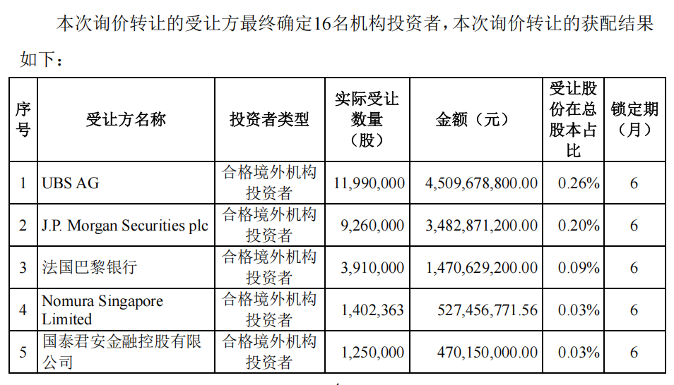 根据机构投资者申购报价情况,并严格按照《认购邀请书》中确定的询价转让价格、询价对象及获配股票的程序和规则,确定本次询价转让的价格为376.12元/股,转让股份数量为4563.24万股,交易金额达171.63亿元。