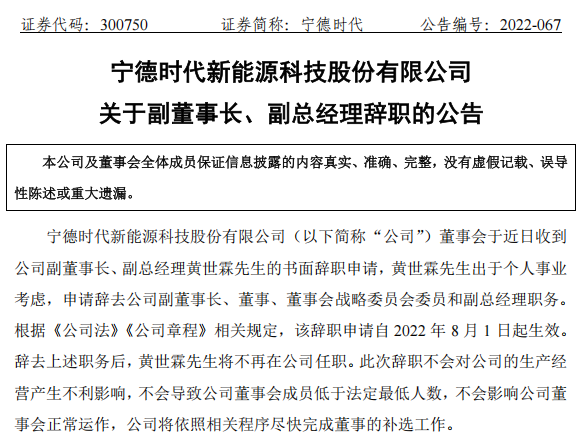 2022年8月1日, 宁德时代 公告称,公司董事会于近日收到黄世霖的书面辞职申请,自2022年8月1日起生效。