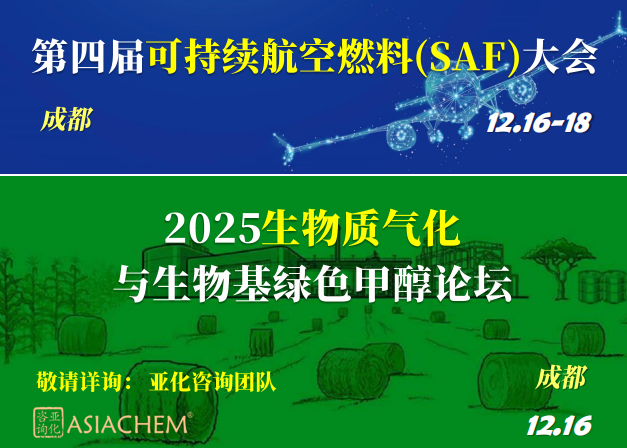 第四届可持续航空燃料(SAF)大会将于2025年12月16-18日在成都召开,会议将探讨全球航空业脱碳趋势与SAF市场和供需展望,SAF的可持续认证与适航认证,油脂加氢(HEFA)、木质纤维素制SAF、醇喷合成(ATJ)、藻类加氢、合成气F-T合成制SAF、生物质气化与绿电、绿氢耦合制SAF、CO2和绿氢直接合成SAF技术,航空公司、飞机制造商和航发制造商的SAF应用经验,中国SAF出口途径与出口潜力等。12月16日,会议还将安排参观可持续航空燃料(SAF)项目,参观名额有限,请尽快联系亚化咨询了解详情!