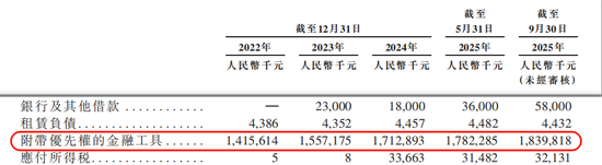招股书显示,这笔优先股负债在报表上体现为“附带优先权的金融工具”,截至2025年9月末,这笔负债是18.39亿人民币(约20亿港元)