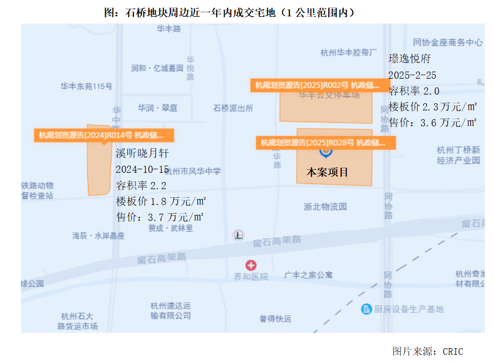 地块成交总价10.1亿元,平均楼板价1.5万元/平方米,地块容积率为2.0,规划建筑面积约6.8万平方米。该地块是杭州城北首宗公交上盖住宅地块,包含公交场站(2.3万平方米)及上盖住宅,公交站占一层,住宅在其上;建筑限高50米。公交场站建成后由 杭州市城市建设投资集团有限公司 负责回购。回购价格以建设主管部门批复的概算为依据,最终以审核的决算价格为准。