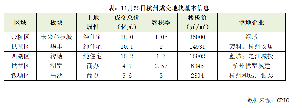 11月25日,杭州出让5宗地块,合计成交价格为54亿元,均为底价成交,其中3宗宅地成交总价为43.3亿元,2宗商办用地成交总价为10.7亿元。