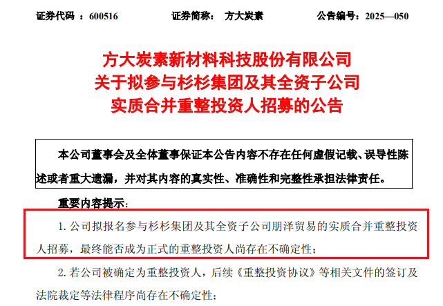 辽宁方大集团 旗下 方大炭素 11月24日晚间公告称,公司董事会同意公司作为产业协同方参与 杉杉集团 及其全资子公司朋泽贸易的实质合并重整投资人招募,同时授权公司管理层代表公司拟定和提交重整投资的报名资料、签署尽职调查保密协议、开展尽职调查、提交《重整投资方案》等各项工作。