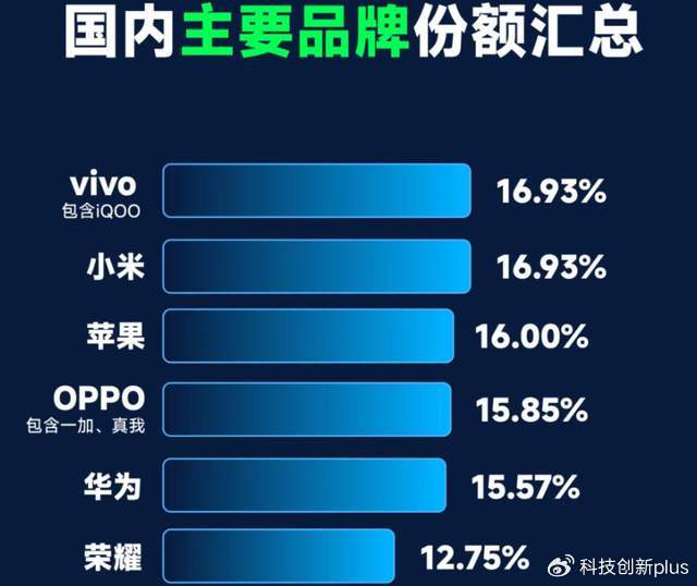 苹果则是16%,OPPO是15.85%,华为是15.57%,这三大厂商相差也是非常小。再之后是荣耀份额为12.75%。其中VIVO包括了IQOO,OPPO包含了一加、realme。