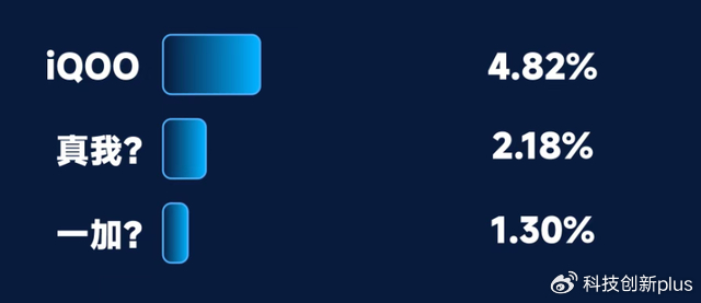 如果VIVO不含IQOO,OPPO不含一加、realme,情况又会怎么样呢?大家可以看下下面这三个品牌的份额,就会明白,iQOO、一加、realme,目前表现还是不错的。