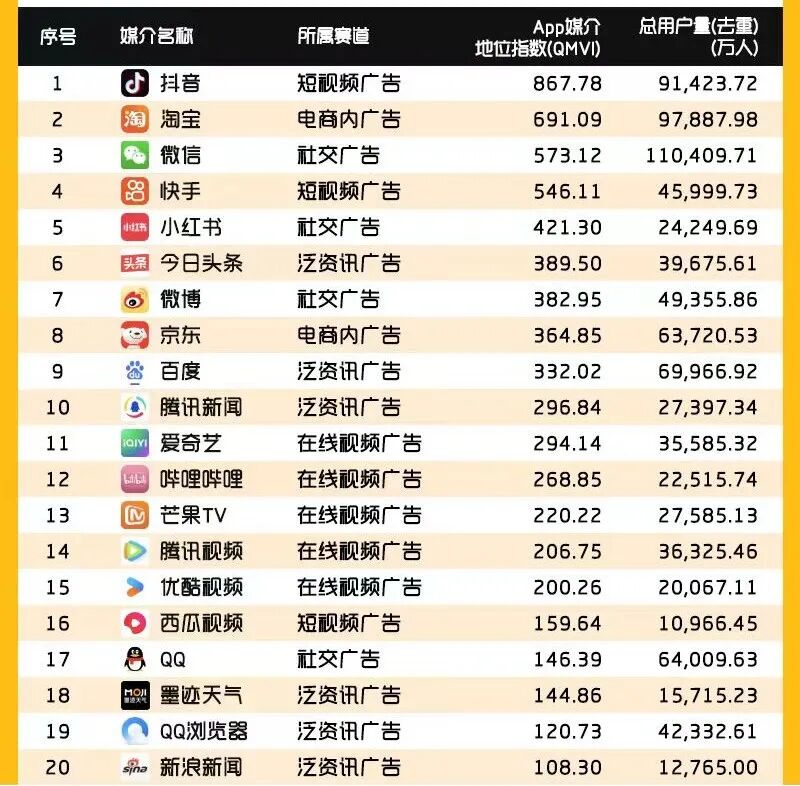 QuestMobile报告证实,2025年6月, 百度 媒介地位指数(QMVI)跌至第九位,排在 抖音 、 淘宝 、微信、 快手 、 小红书 后面。