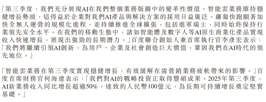 而在财报中,AI也是 百度 重点着墨的绝对“C”位:AI云强劲增长33%;萝卜快跑全球化提速,本季度订单同比猛增212%,飙升至310万单;在移动生态中,智能体和数字人等AI原生应用也得高增;文心5.0(文小言)展現强大性能……