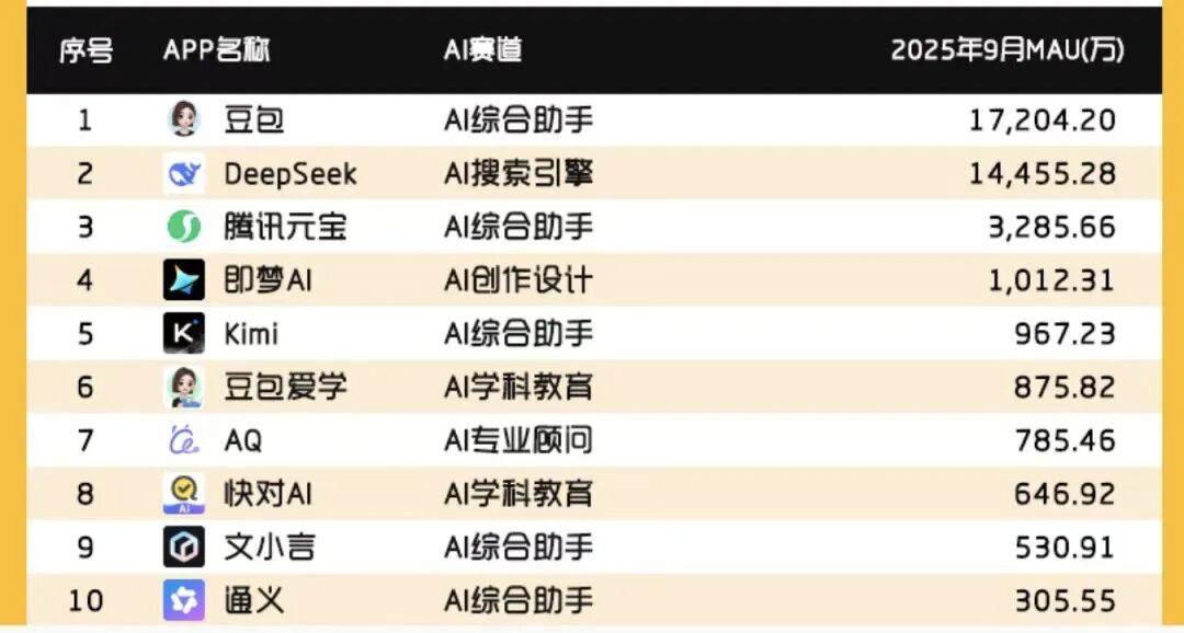 Questmobile统计,文小言今年9月的月活用户数堪堪超过500万,在对应的排行榜上位列第九,与字节旗下 豆包 (1.72亿月活)、DeepSeek(1.44亿月活)、腾讯旗下元宝(3285万月活)等,相距甚远。