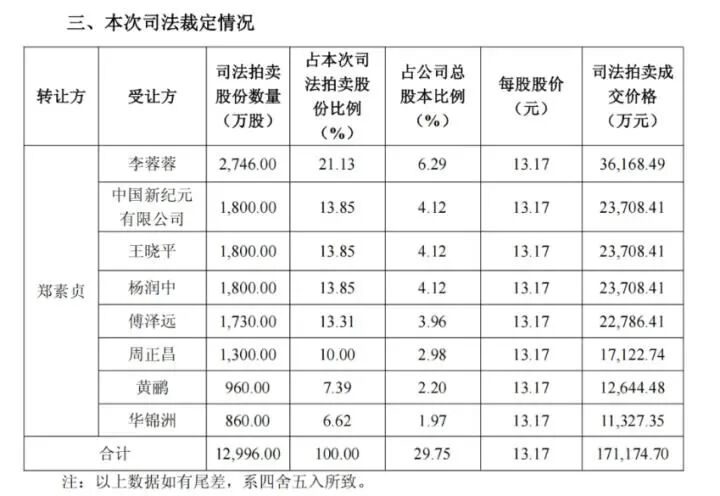 7月下旬,郑素贞持有的 大恒科技 股份就被挂上了拍场。8月4日晚, 大恒科技 公告称,公司控股股东、实际控制人郑素贞( 徐翔 母亲)所持1.3亿股无限售流通股已完成司法拍卖,占公司总股本比例为29.75%。