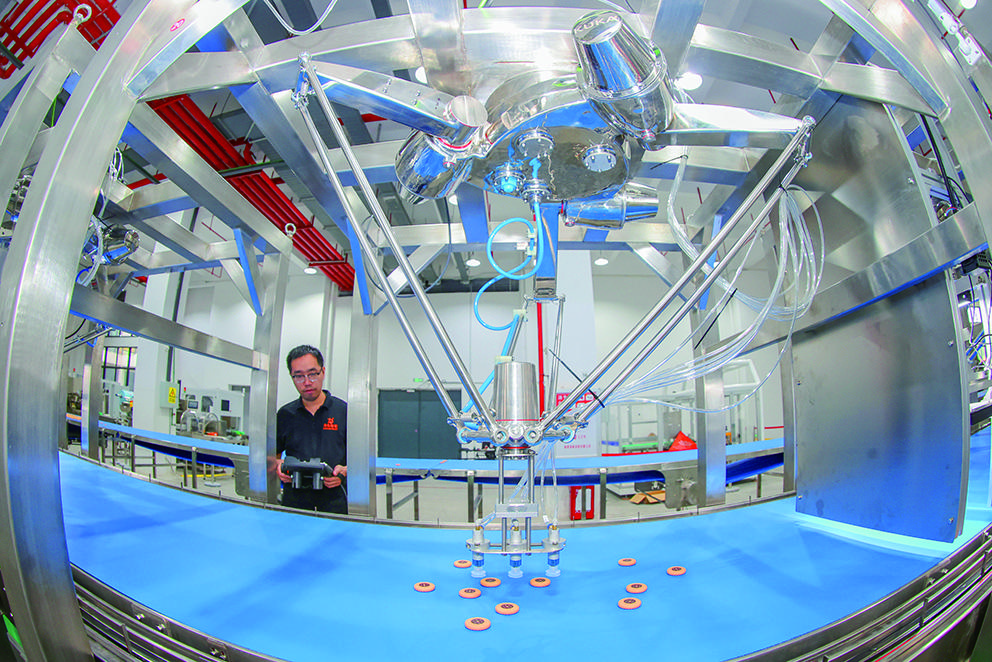 在泉创智能生产线上,12台机器人配合6套高速视觉系统与自主AI定位算法,对流水线上无序分布的饼干进行高速识别、精准抓取、自动装盒,实现从进料、视觉检测到分拣装盒的全流程智能化作业。
