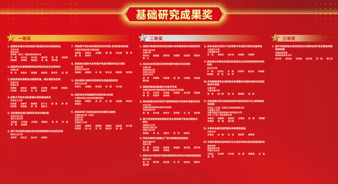 11月21日上午,在北京召开的中国化工学会第四十一届理事会第五次会议上,2025年度中国化工学会科学技术奖隆重颁发。60项科学技术成果获得奖项,其中中石化石油化工科学研究院有限公司“低干气产率的新型变径流化床催化裂化技术研究开发及工业应用”等25项成果获得“科技进步奖”,宁夏大学“百万吨电石渣-含CO2尾气制备微晶碳酸钙成套工艺及其下游产品”等10项成果获得“技术发明奖”,江苏大学“超薄层状催化剂的微纳尺度调控及高效制氢机制”等25项成果获得“基础研究成果奖”。