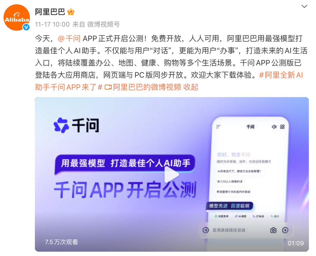 11月17日,阿里又让千问以“集团级入口”的名义重新登场。这样的节奏变化更像是一场临时换将的仓促操作。表面上其实已经存在已久的千问突然“回宫”,背后无疑暴露出阿里内部对AI入口归属的不确定与焦虑。