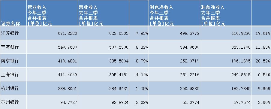 面对银行业普遍承受的息差收窄压力,6家城商行前三季度均实现营收、净利润双增。拆解营收构成来看,6家银行利息净收入全部实现同比增长,其中南京银行、江苏银行增速分别高达28.52%、19.61%,在所有A股42家上市银行中亦居于前列。