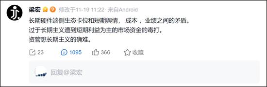 值得注意的是,就在周报发布前两天,梁宏曾公开表示:“长期硬件端侧生态的卡位,与短期舆情、成本、业绩之间存在矛盾。过于长期主义遭到以短期利益为主的市场资金的毒打。资管要坚持长期主义的确很难。”这一表态或许更能反映他的真实感受。