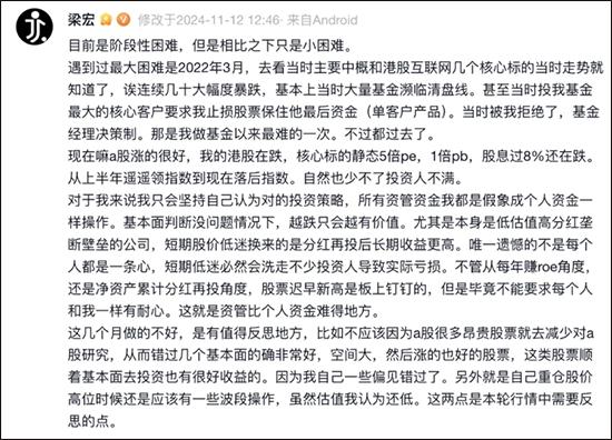 实际上,去年11月份,梁宏也曾因业绩回撤公开做出解释,发文反思错过股市行情。