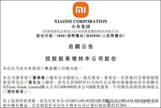 11月24日, 小米 集团在港交所发布公告称, 小米 集团创始人、董事长兼CEO雷军个人斥资超1亿港元增持 小米 集团260万股,雷军持股比例增加至23.26%。本月, 小米 集团连续两日大手笔回购公司股票2150万股,总斥资金额超8亿港币。今年以来, 小米 集团累计回购金额已超23亿港币。