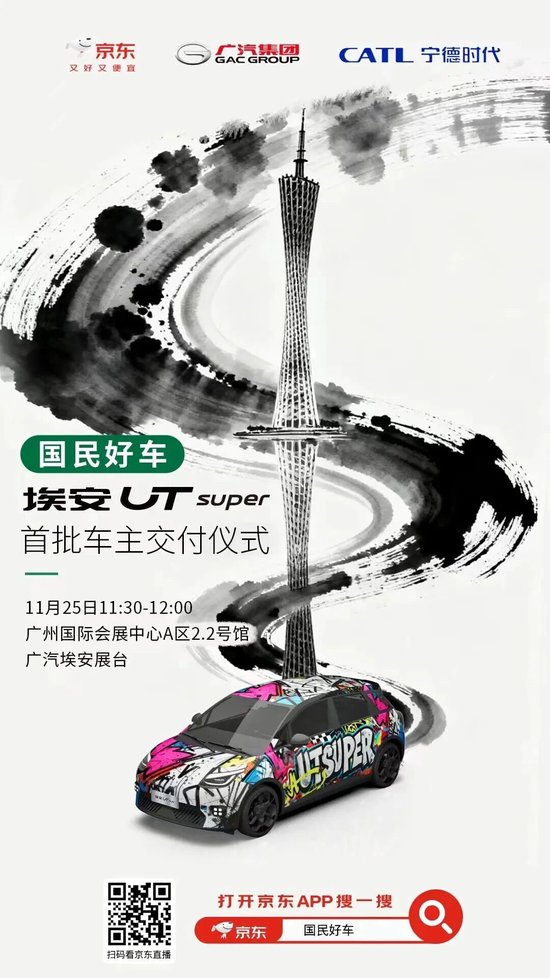 11月25日,京东、广汽集团、宁德时代联合推出的“国民好车”——埃安UT super首批车主交付仪式在广州车展上举行。