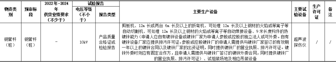 针对钢管杆标段,资格预审申请文件中必须提供相关产品报告扫描件,报告需包含以下数据:零部件尺寸、焊缝外观质量、焊缝内部质量三个数据。无论试验报告是否已参加核实,均须提供包含上述数据的完整版的试验报告扫描件。若申请人未提供满足资格预审文件要求的试验报告扫描件,在资格预审评审阶段将会对申请人带来不利影响。但相关支持证明文件扫描件的时间不受上述时间限制,且为非否决项。