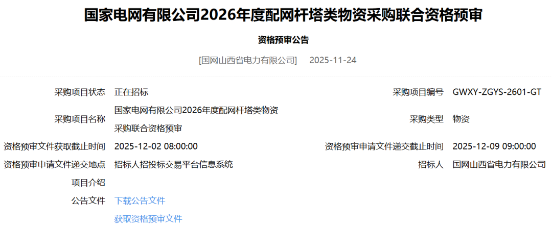 国家电网有限公司2026年度配网杆塔类物资采购联合资格预审资格预审公告