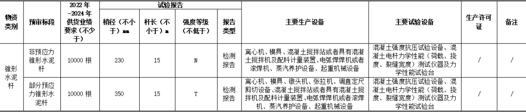 针对锥形水泥杆标段,资格预审申请文件中必须提供相关产品报告扫描件,非预应力锥形水泥杆至少需提供(Ф230,15,N)型号对应的试验报告,部分预应力锥形水泥杆至少需提供(Ф350,15,T)型号对应的试验报告。报告需包含以下数据:开裂检验弯矩下的裂缝宽度、挠度检验,承载力检验弯矩下的裂缝宽度、挠度检验四个数据。无论试验报告是否已核实,均须提供包含上述数据的完整版的试验报告扫描件。若申请人未提供满足资格预审文件要求的试验报告扫描件,在资格预审评审阶段将会对申请人带来不利影响。