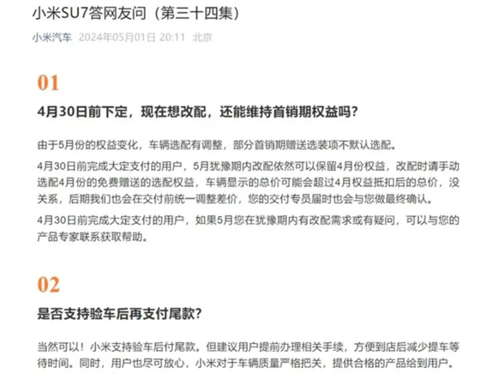 小米 汽车官方微信公众号在《 小米 SU7答网友问(第三十四集)》中明确表示“支持验车后付尾款”