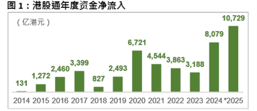 这一逻辑不仅被国际资金认可,更是理解中国商业模式的南下资金已经在用脚投票。截至2025年9月,港股通资金年内净流入已突破1万亿港元,较2024年全年高33%;截至今年6月底,公募基金在港股的投资市值已接近1万亿元人民币。据香港交易所数据,2025年前8个月,港股通的日均成交额为608亿港元,占整个市场成交额的24.5%。