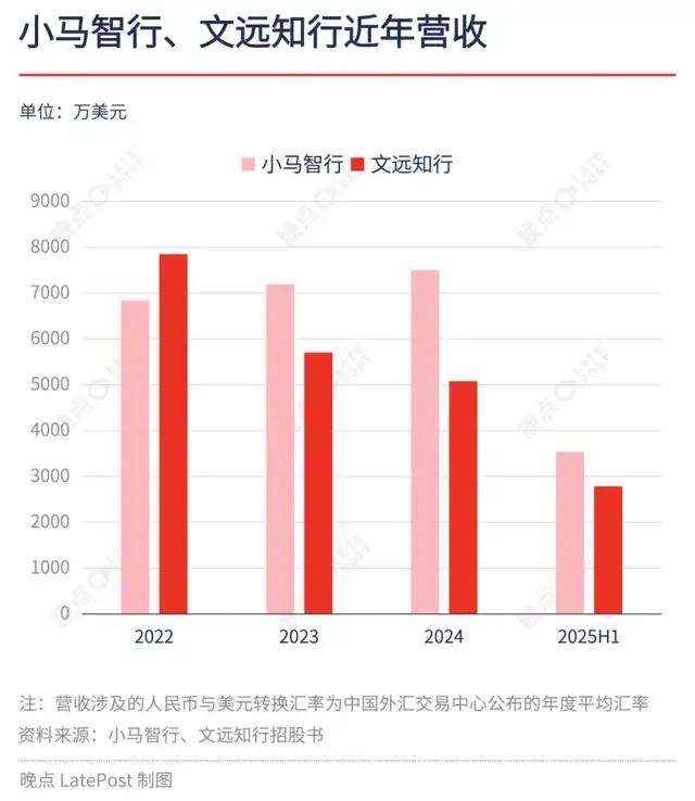 就像 滴滴 已经做到了互联网打车生意的第一,但在很长一段时间内依然不时受到地方上公司的竞争压力。不过有投资人告诉我们,小马对此乐观,因为“ 滴滴 40%的收入来自于一线城市。”  投资人还担心,如果 Robotaxi 的终极目标是替代出租车,那未来必须比网约车便宜才可能推广开,这意味着单车年收入会大幅波动。即便不看成本和利润率,一台车年收入 10 万元,一万台也就 10 亿元。“现在连 10 亿元营收都还没做到,怎么支撑几百亿市值?”  今年上半年,小马和文远的营收分别为 3543 万美元、2787 万美元,净亏损分别为 9064 万美元、1.1 亿美元。现在两家公司的港股市值分别为 376 亿港元、211 亿港元。