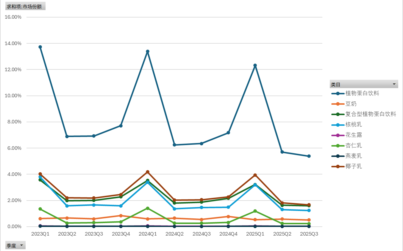 2023Q1-2025Q3植物蛋白饮料及各细分品类市场份额变化。马上赢供图