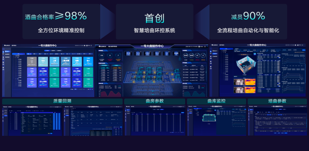 该项目总建筑面积5.4万㎡,主要用于制曲、培曲和存曲工艺环节。改造前,生产依赖人工操作,难以实现精准化与标准化,高水平人才短缺制约规模扩张,劳动强度大导致人员流失严重,产品质量稳定性不足。接入 格力 泰山楼宇数智化平台后,实现了全方位环境精准控制,酒曲品质合格率提升至98%以上; 格力 首创的智慧培曲环控系统,实现了全流程自动化与智能化运行,人员配置优化率达90%。