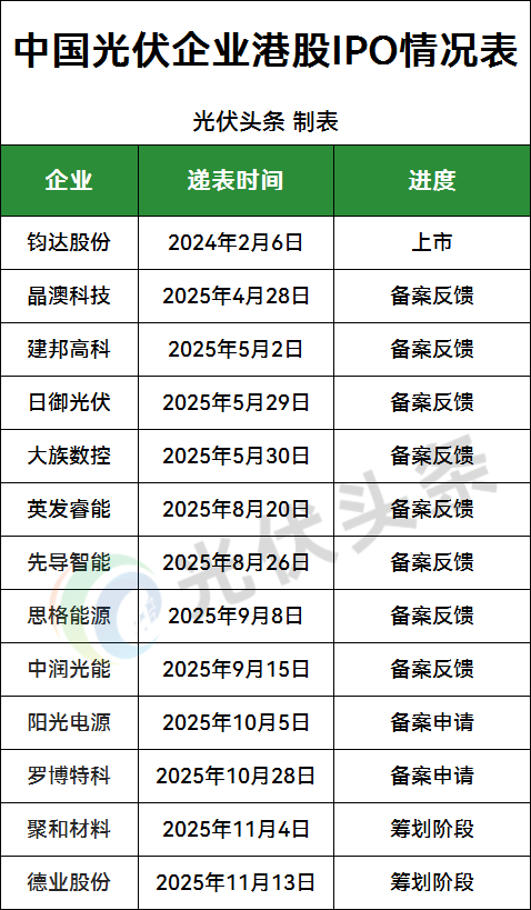 截至目前,2025年已经有13家光伏企业计划或者实施赴港上市行动,其中 钧达股份 在递表1年后,成功上市。 晶澳科技 、 阳光电源 、 先导智能 、 罗博特科 等光伏企业已经正式递表, 聚和材料 与 德业股份 则发布了拟赴港上市的公告。