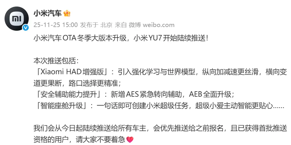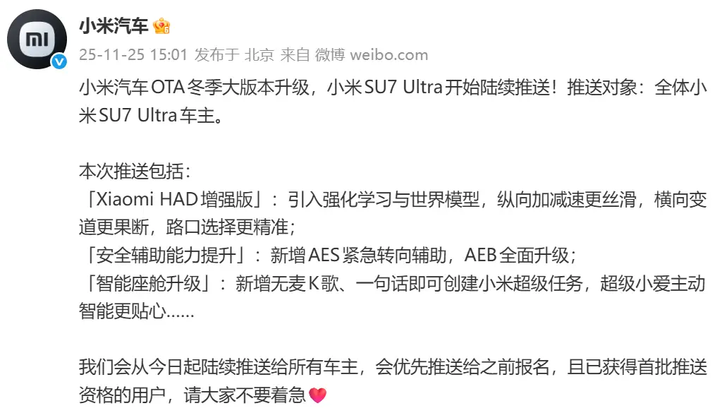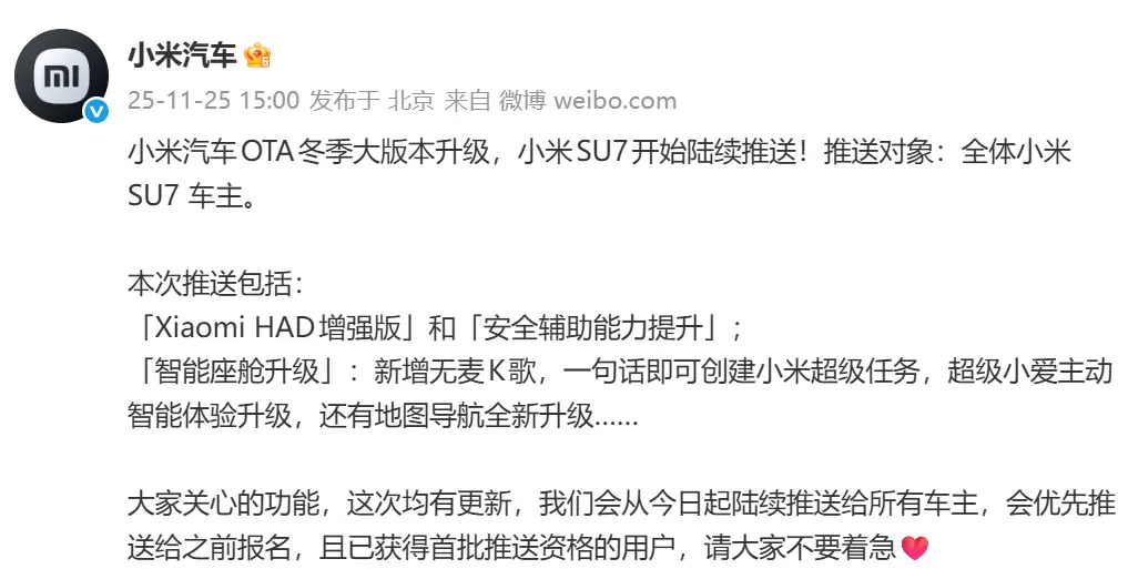 小米全系列车型迎来OTA冬季大版本升级,均推送「Xiaomi HAD增强版」