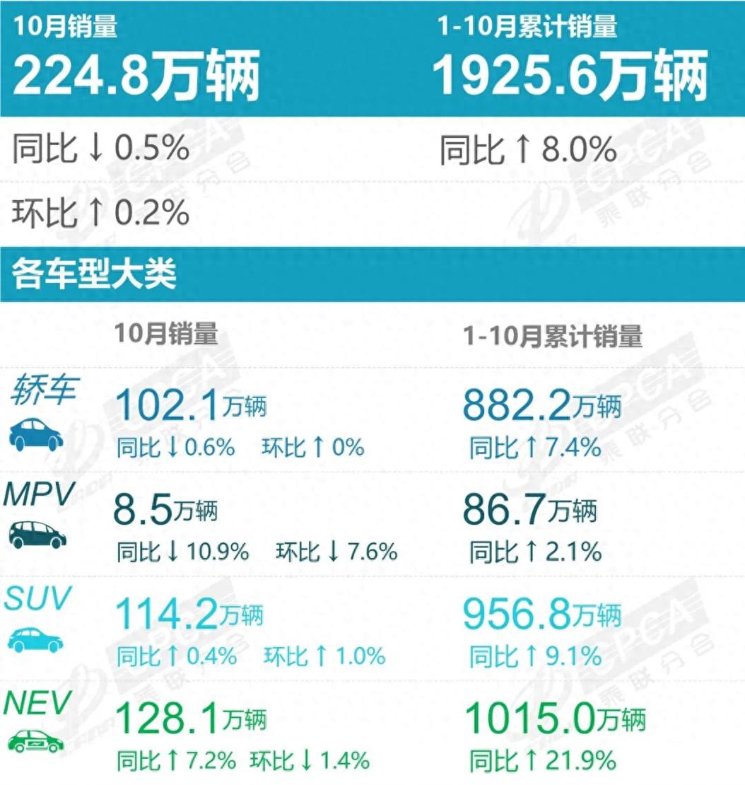 从细分市场来看:10月份,轿车市场销量为102.1万辆,同比下滑0.6%,环比持平;SUV市场销量为114.2万辆,同比增长0.4%,环比增长1.0%;MPV市场销量为8.5万辆,同比下滑10.9%,环比下滑7.6%。而新能源市场销量达128.1万辆,同比增长7.2%,环比下滑1.4%。