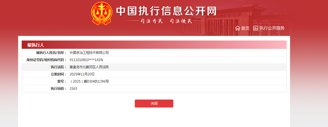 此外,中国执行信息公开网显示,中国京冶近日亦成被执行人,立案时间为2025年11月20日,其被 秦皇岛市北戴河区人民法院 执行标的2563元,案号(2025)冀0304执1396号。