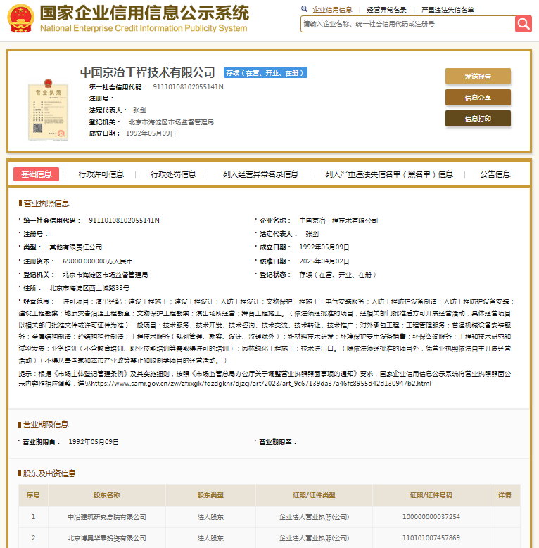 国家企业信用信息公示系统显示, 中国京冶工程技术有限公司 成立于1992年,注册资本69000万元人民币,法定代表人张剑,大股东为 中冶建筑研究总院有限公司 。