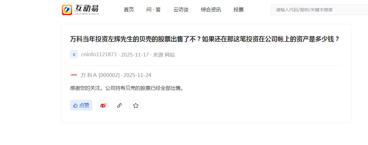 久期财经讯,11月24日, 万科企业 股份有限公司(简称“ 万科企业 ”,02202.HK,000002.SZ)在深交所互动易平台上就投资者提出的万科当年投资的贝壳(BEKE.US)股票是否出售的问题作出回应。