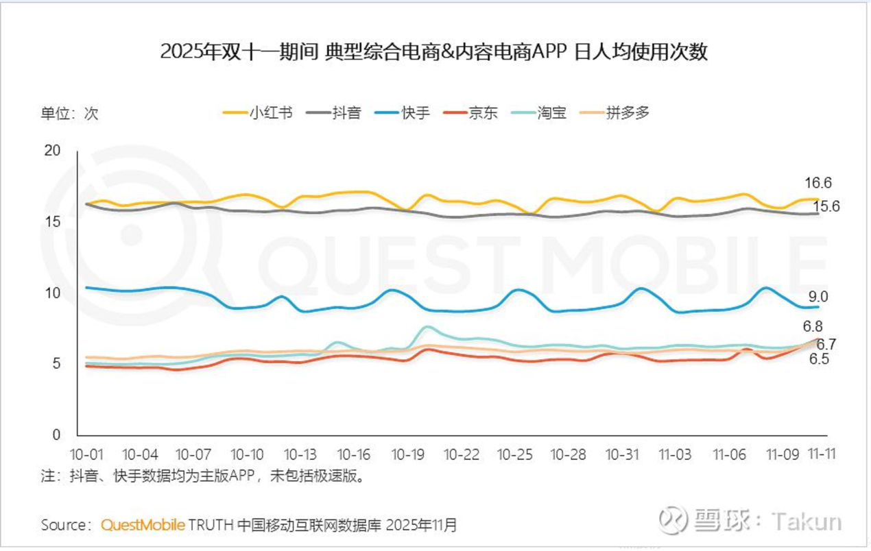 QuestMobile:2025年双11期间小红书日人均使用次数排名第一