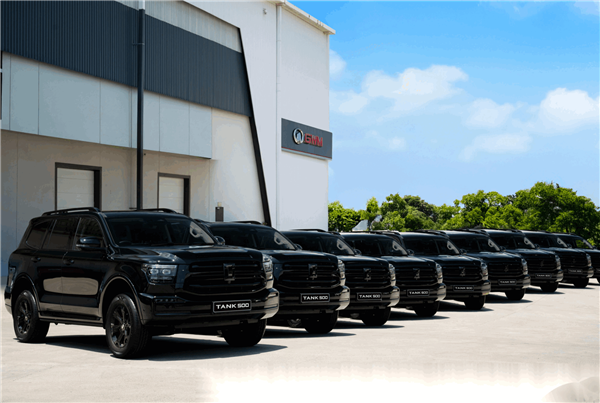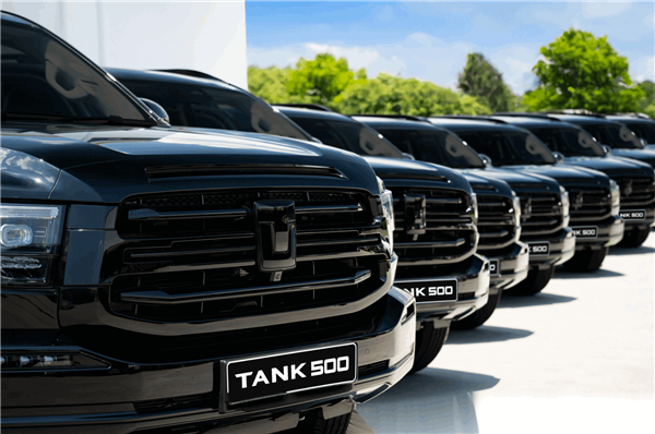 官方展示的照片显示,一排全黑涂装的坦克500摆放在场地,整体极具贵气和豪华气场。