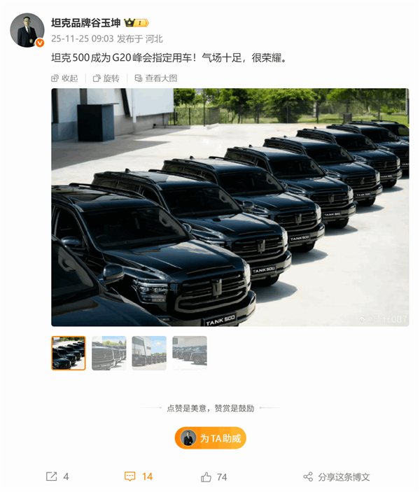 快科技11月25日消息,长城汽车官方宣布,坦克500成为G20峰会官方指定用车。