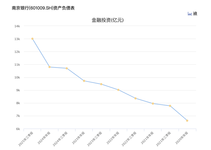 季报显示,今年前三季度, 南京银行 行公允价值变动收益由上年同期的46.8亿元盈利转为亏损3.34亿元,同比减少50亿元,降幅高达107%。同期,该行金融投资规模1.3万亿元,占总资产比重高达43.9%,远超同期城商行平均水平。