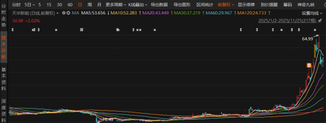在储能需求爆发带动锂电产业链回暖以及 宁德时代 26.35亿元战投催化下, 天华新能 近期股价持续刷新阶段高点,11月20日盘中走高至64.99元/股,触及2023年以来的阶段新高。随后两个交易日股价出现回调,截至11月25日收盘, 天华新能 报50.99元/股,涨幅2.02%,当前股价仍较年初上涨128.85%。