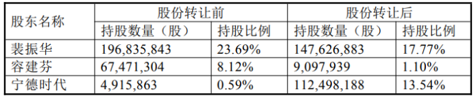 10月31日, 天华新能 发布公告称,公司实控人裴振华、容建芬夫妇与 宁德时代 签署股份转让协议,拟向 宁德时代 协议转让1.08亿股公司股份,占总股本的12.95%。其中,裴振华转让4920.9万股,容建芬转让5837.34万股。上述股份转让价格为每股24.49元,转让价款合计26.35亿元。